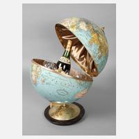 um 1950, klappbarer Korpus in Form eines Erdglobus´, innen mit cremefarbener Seide ausgekleidet sowie bedruckter Kartonmontierung, darin sechs Weinbrandschwenker sowie eine ungeöffnete Flasche Dujardin, leichte Altersspuren, H 45 cm.