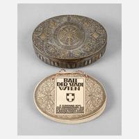 1911, anlässlich des Balls der Stadt Wien am 7. Februar 1911 zur Erinnerung an die Vollendung der II. Kaiser-Franz-Josef-Hochquellenleitung, gemarkt Wilhelm Melzer Wien VII, Messing geprägt, mit Resten alter Versilberung, ovale Deckeldose mit ornamentalen Reliefs, mit bebilderten Beilage inkl. Spielplan, 36 Blatt, Maße 4 x 10,5 x 7,5 cm.