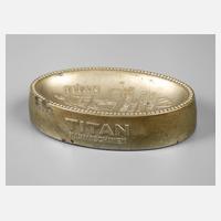 1920er Jahre, Weißblech geprägt, für die Firma Gustav Winselmann GmbH, Nähmaschinenfabrik Altenburg in Thüringen, ovales Modell mit Fabrikansicht und Werbefigur, Altersspuren, L 11 cm.