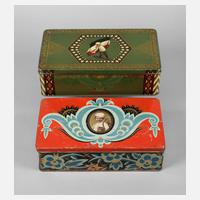 Anfang 20. Jh., eine mit Hersteller Bühler & Co. Cannstatt (Württ.), Weißblech farbig lithografiert, teils goldbronziert, hochrechteckige Dose Cacao–Chocoladen–Bonbons–Lebkuchen–Zuckerwaren & Paniermehl-Fabrik Carl Bader Aalen sowie Deckeldose der Konditorei Trömel Plauen i.V., Z 2, H 31 und 15 cm.