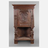 wohl Mitte 17. Jh., Eiche massiv, braun gebeizt, eintüriger Korpus mit fein geschnitzter Front, Kassettenfüllung mit Darstellung der Flucht aus Ägypten, die Lisenen ebenfalls kassettiert und floral geschnitzt, getragen von zwei halbplastischen Karyatiden, alt restauriert, mit späteren Ergänzungen, mit Schlüssel , H 171 x B 103 x T 55 cm.