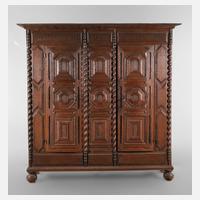 norddeutsch, in der Krone datiert 1747, breiter zweitüriger Schrank, aufwendig verzierte Front mit kleinen Bastionsfüllungen, Flammleisten und spiralförmigen Halbsäulen, zerlegbarer Schrank, Rückwand und Regalböden später ergänzt, innen cremefarben gestrichen, mit zwei originalen Schlüsseln, Maße H 199 x B 200 x T 65 cm.