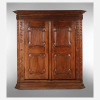 Eiche massiv, 2. Hälfte 18. Jh., komplett zerlegbarer zweitüriger Schrank, reich mit Schnitzereien verziert, aufwendig gearbeitetes Profilgesims, innen mit originalem Einlegeboden, alt restauriert, Maße H 205 x B 196 x T 67 cm.