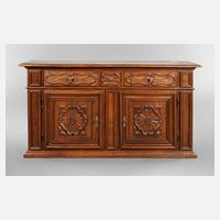 Piermont, Ende 18. Jh., Nussbaum massiv, reich geschnitzte Front mit zwei Türen und drei Schubkästen, alt restauriert, Oberfläche mit Altersspuren, H 89 x B 182 x T 53 cm.