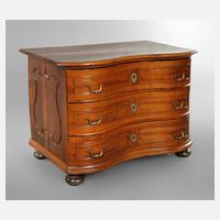 wohl Franken, Mitte 18. Jh., Eiche massiv und furniert, dreischübiger Korpus mit zweifach gebauchter Front, geschnitzte Kassettenfüllungen, die mittleren Kassetten etwas vorgesetzt, originale Messingbeschläge, seitlich geschnitzte lyraförmige Kartusche, die Rückwand wurde in jüngerer Zeit verfestigt, sonst guter Originalzustand, Maße 81 x 115 x 67 cm.