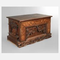 im Renaissancestil, um 1900, Eiche braun gebeizt, Front und Seiten mit Schnitzereien und Einlegearbeiten verziert, eine Zierleiste lose beigegeben, normale Altersspuren, 64 x 110 x 62 cm.