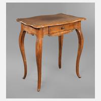 Eiche massiv, Mitte 18. Jh., geschweifte Platte mit profiliertem Rand, geschwungene Zarge und Beine, Front mit Schubkasten, Oberfläche mit Gebrauchsspuren, Maße 76 x 70 x 47 cm