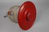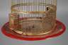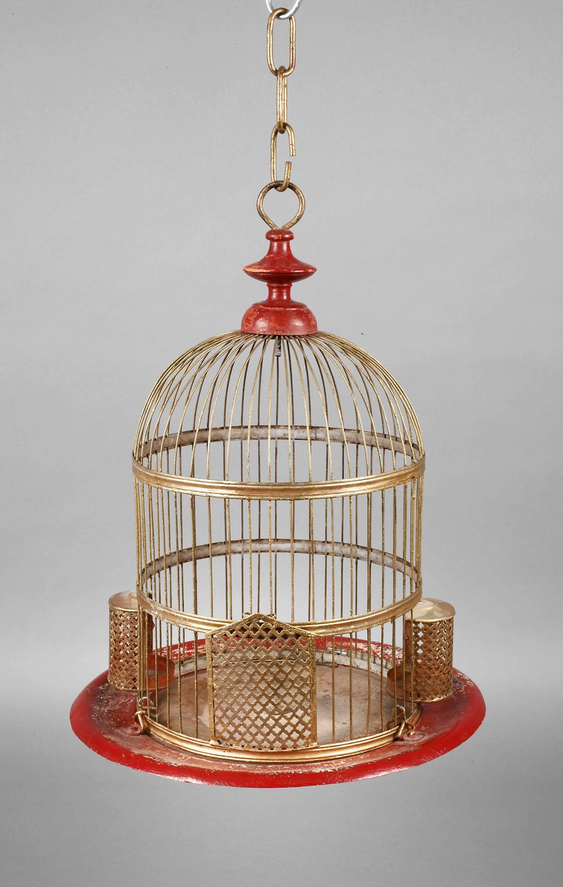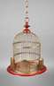 19. Jh., in Form einer Fußschale gearbeitete Basis aus rot lackiertem Weißblech, kuppelförmiger Käfig mit schlanken Streben, eine Öffnung und zwei Futterstellen, Altersspuren, H 45 cm.