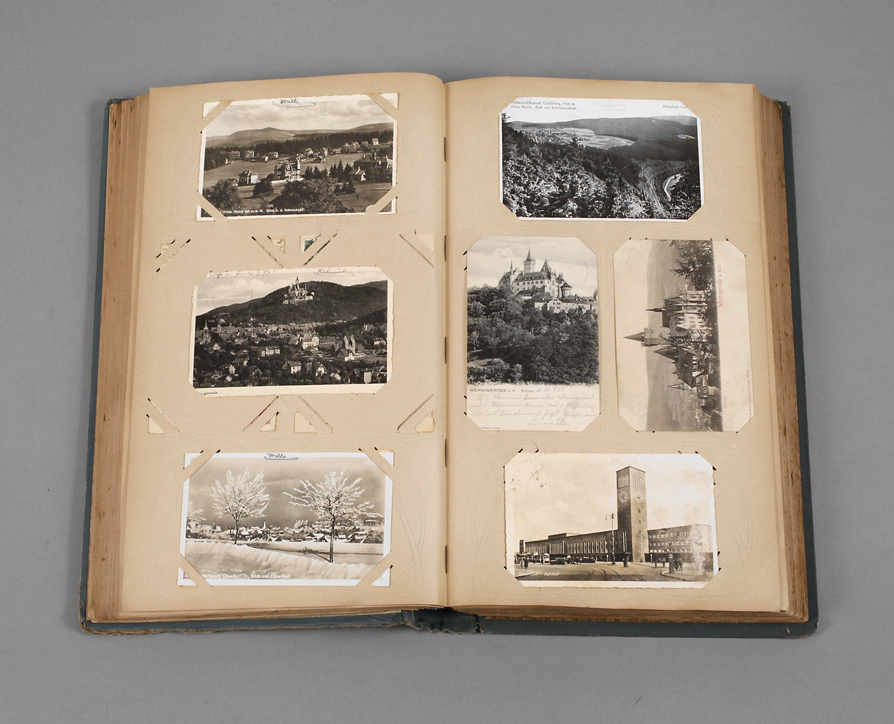 1. Hälfte 20. Jh., ca. 512 vorwiegend topographische Ansichtskarten, u.a. Wesenstein, Wernigerode, Eisenach und Wartburg, Winter im Thüringer Wald, Mühltal, Rudelsburg und Saaleck, Jubiläumskarte ”zum 400 jähr. Reformations-Jubiläum”, Thüringer Wald, Gruss aus Berlin, ... aus Görlitz, ... dem Vogtland, ... aus Eisenach, ... aus Pillnitz, ... von der Rochsburg, ... vom Inselberg, ... aus Frauenstein, ... aus Eisenberg in Thüringen, ... aus dem Rabensburger Grund, auf manchen Karten Gedichte, z.T. schöne Karten mit Naturmotiven, manche Postkarten ohne Motiv, teilw. farbig lithogr., meist postalisch gelaufen, in zeitgenössischem Album mit geprägtem Jugendstilmotiv, teilweise an Kanten beschädigt, Karten mit normalen Alters- und Gebrauchsspuren, Maße ca. 39 x 23x 6,5 cm.