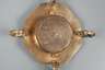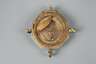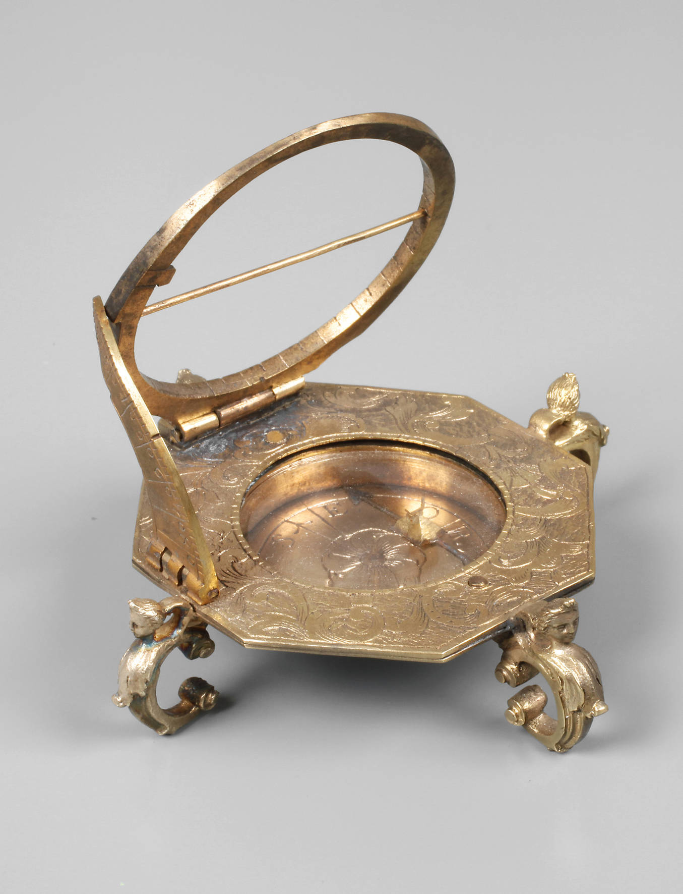 Augsburg, um 1770, rückseitig signiert A. Vogler, Messing, oktogonale, ornamental und floral gravierte Grundplatte mit eingelassenem, verglastem Magnetkompass, welcher die Nord-Süd-Richtung justiert, die geographische Breite des Beobachtungsortes wird am seitlichen Viertelkreis eingestellt, mittels eines kleinen Lots wird die horizontale Lage überprüft, die Ortszeit gibt der Schatten auf einem mit röm. Ziffern versehenen barocken Stundenkreis an, Magnetnadel lose, ein Fuß repariert, Altersspuren, L 7 cm.