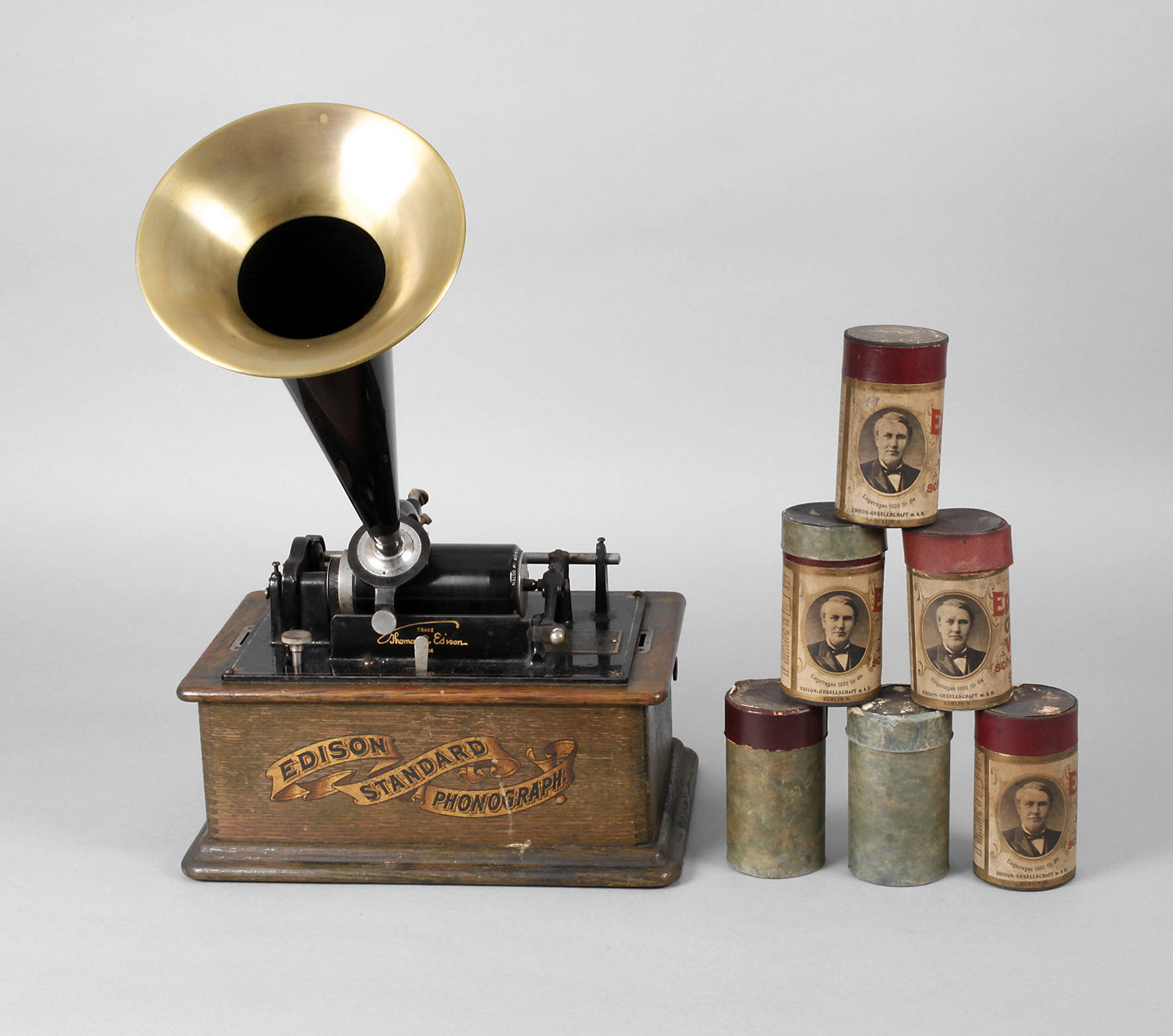 nach 1905, gemarkt Edison Standard Phonograf, sowie weitere Plakette mit Patentangaben, braun gebeiztes Eichengehäuse, Metallteile orig. schwarz lackiert, Werk läuft, Deckel fehlt, Alters- und Gebrauchsspuren, dazu 7 Walzen, H mit Trichter 50 cm.
