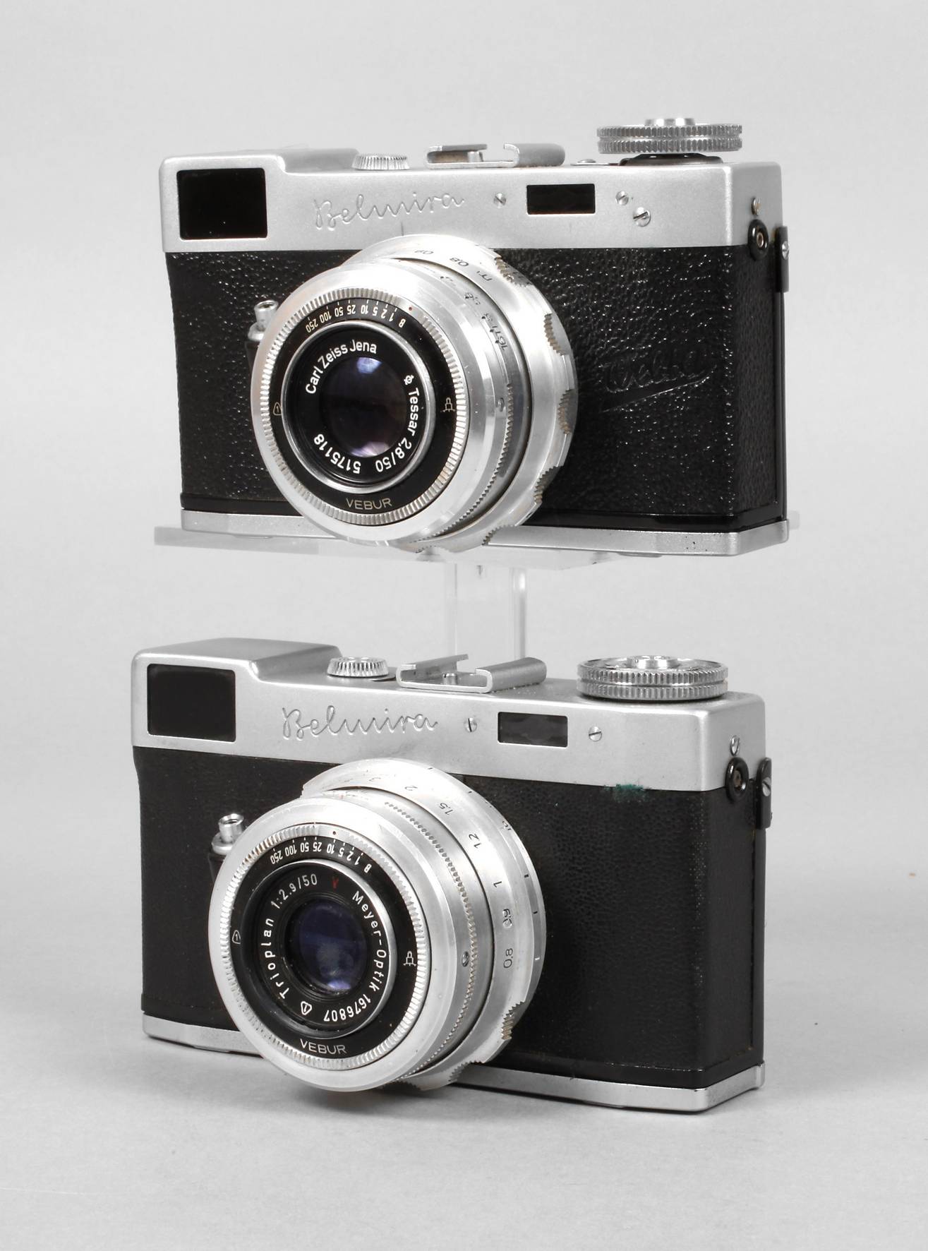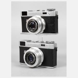 Mitte 20. Jh., gemarkt, Modell Belmira, einer mit Objektiv Carl Zeiss Jena Tessar 2.8/50, der andere mit Objektiv Meyer-Optik Trioplan 1:2.9/50, funktionstüchtig, Alters- und Gebrauchsspuren, einer im original Lederetui.