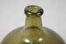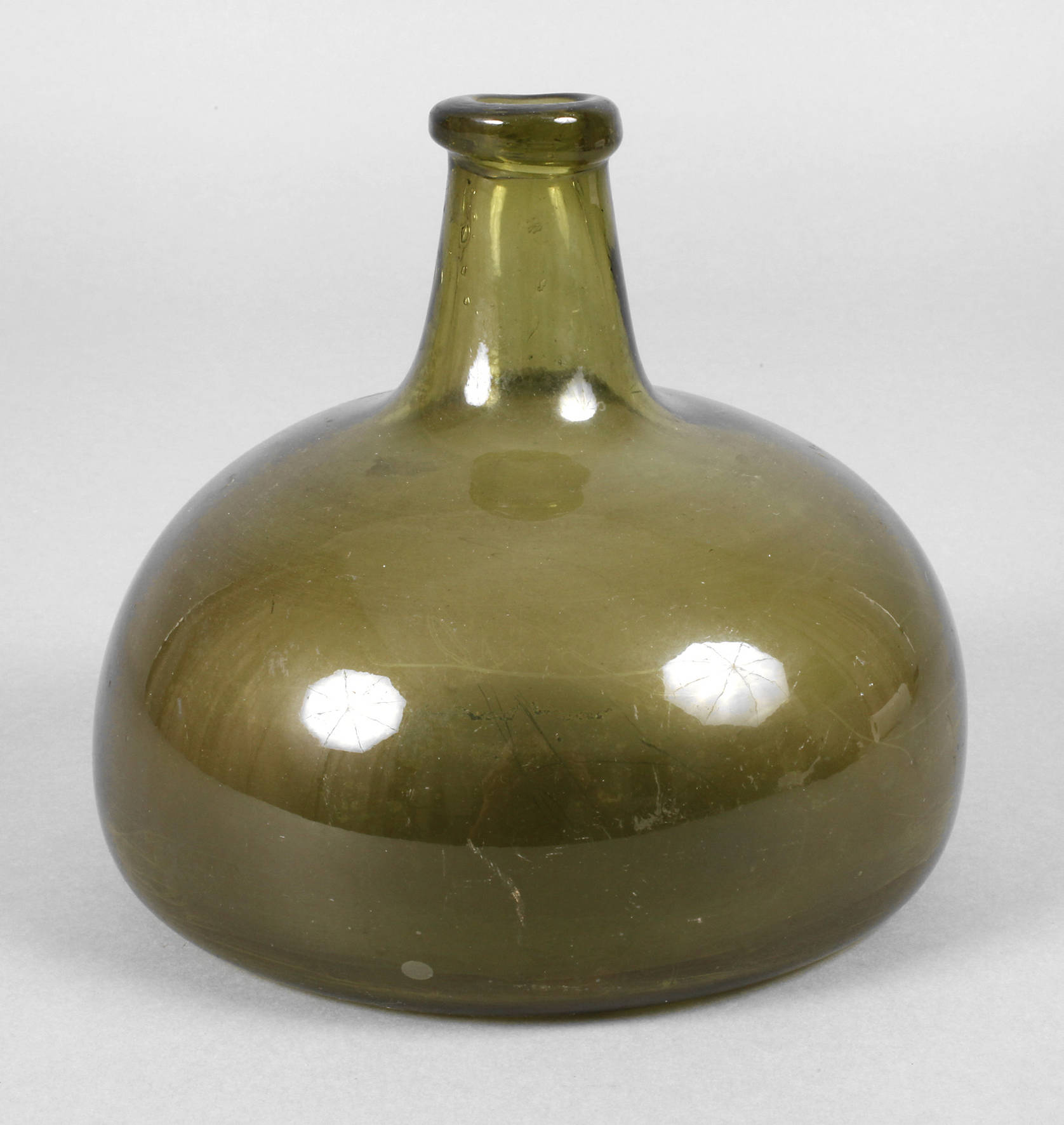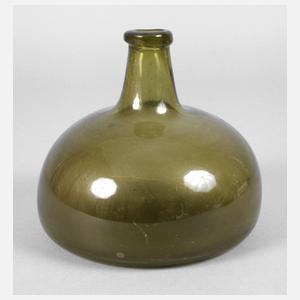 18. Jh., grünes blasiges Glas, eingedrückter Boden mit Abriss, abgeflachte Flaschenform, mit langem Hals und verdickter Mündung, Gebrauchsspuren, ohne Stopfen, H 15,5 cm.