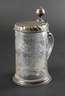 wohl um 1720, im Zinndeckel drei Punzen, Löwe im Wappen, Meisterzeichen und weitere Punze X im Wappen mit Jahreszahl 1722, Walzenkrug aus farblosem Glas mit blasigem Abriss, äußerst feine Gravur in Mattschliff, halbnackte junge Frau im Bade, umgeben von Rollwerk und Blüten, Aufschrift: ”Ich habe meine Frau ins bath geschickt die krancke, sie haben sie hinten u. forn geflickt ich dancke.”, Zinnmontierung bestehend aus Standring und übergreifendem godronierten Deckel, großer Kugeldrücker, Henkel mit floralem Ornament, dieser haarrissig und ein Einriss am Deckel, H 22,5 cm.