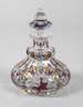 um 1840, vermutlich Raffinerie Friedrich Egermann Haida, farbloses Glas, geschliffener Bodenstern, bunte Emailbemalung, ovale reliefierte Kartuschen mit schwarz konturierten Rittermotiven zu Pferde, umlaufende florale Bänder, Stopfen innen mit winzigen Kerben, sonst guter Zustand, mit normalen Gebrauchsspuren, H 14 cm. Quelle: Passauer Glasmuseum, Das Böhmische Glas, Band II, S.136, 137 und 138, dort ähnliche Gläser.