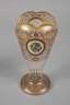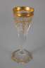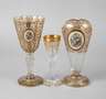 Ende 19. Jh., Vase und Pokalvase, zusammengehörig, dazu ein Trinkglas, alles mit reicher Goldmalerei verziert, zwei Kuppen mit Blütenbuketts in ovalen Kartuschen, etwas berieben, die Vase mit kleiner oberflächlicher Fehlstelle innen am Rand, H max. 25,5 cm.