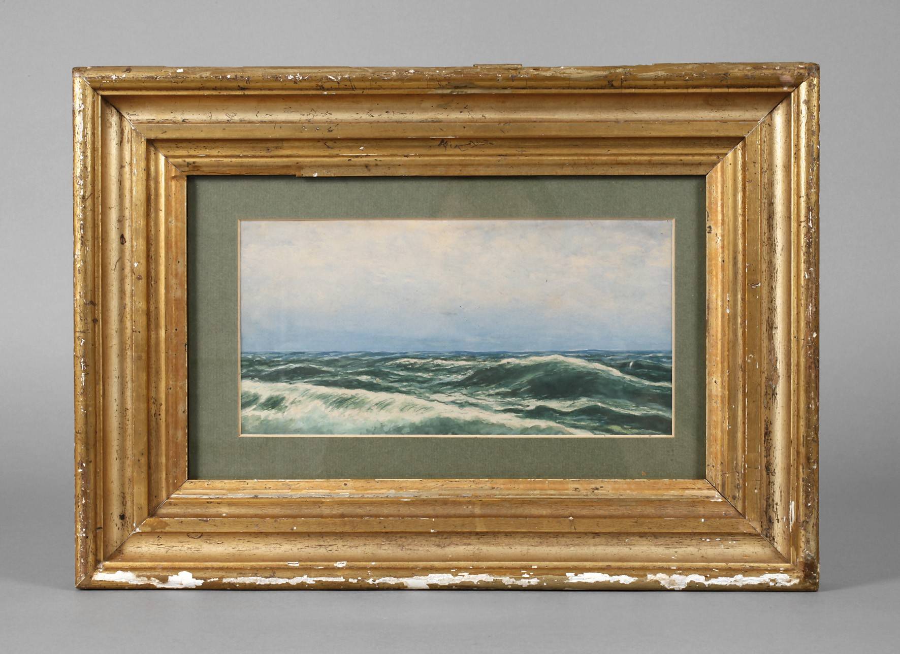 um 1860, Rahmen aus ca. 6 cm breiter, steigend profilierter, gestuckter und vergoldeter Holzleiste, Gehrungen geschnitten, Erhaltungsmängel, Falzmaß ca. 19,5 x 32 cm, beigegeben Aquarell ”Seestück” unter Passepartout und hinter Glas.