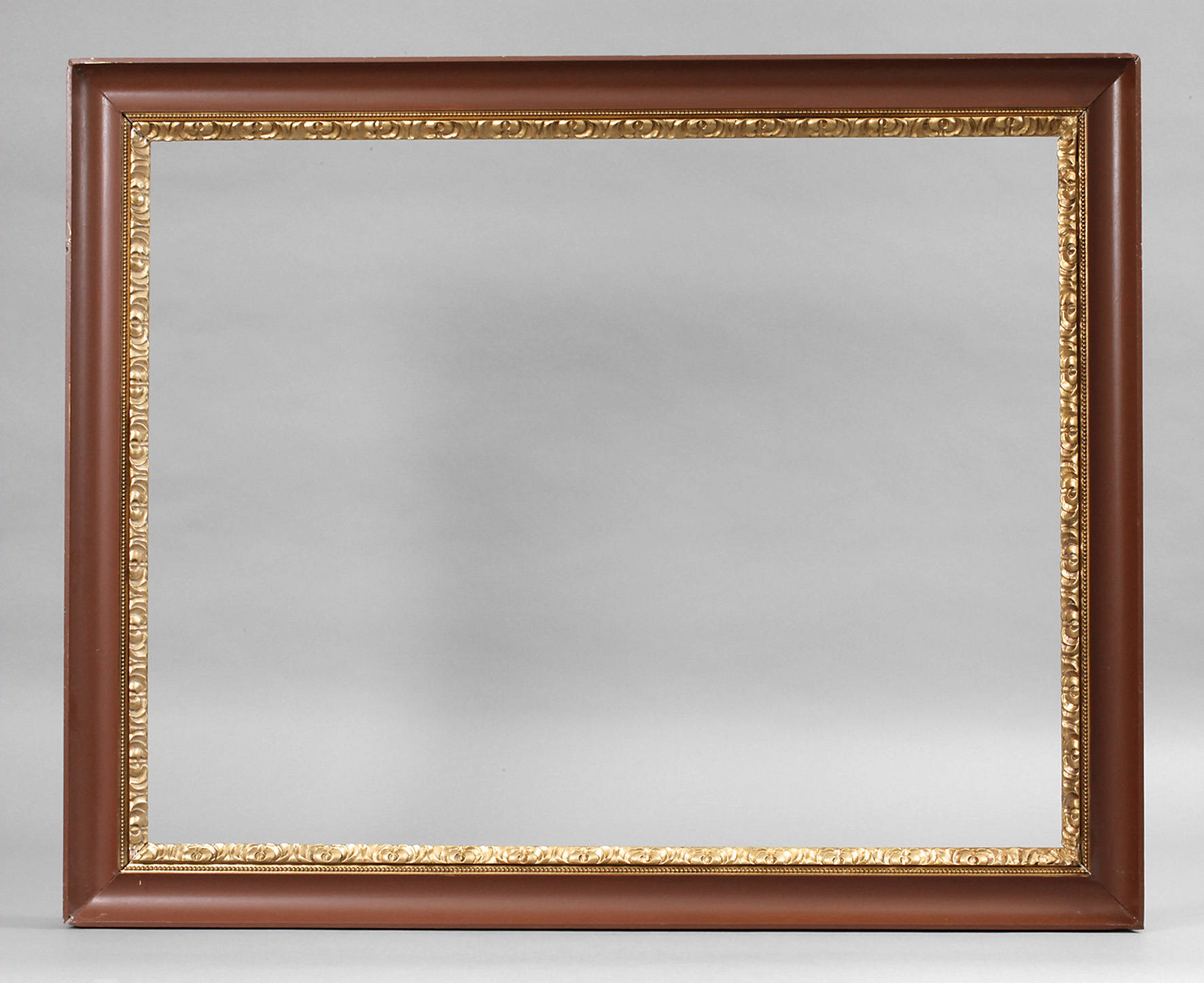 Rahmen aus ca. 8 cm breiter, steigend profilierter und braun überfasster Holzleiste mit ornamentaler, goldbronzierter Innenkante, Gehrungen geschnitten, geringe Erhaltungsmängel, Falzmaß ca. 92 x 72 cm.