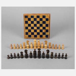 um 1900, ungemarkt, Holz gedrechselt und geschnitzt, teils ebonisiert, in ergänzter quadratischer Laubholzschatulle, die Deckelinnenseite mit gemaltem Schachbrett, kompletter Figurensatz, Alters- und Gebrauchsspuren, H König 6,5 cm.