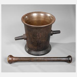 19. Jh., Eisenguss bronziert, leicht konisch zulaufende zylindrische Wandung mit ausschwingender Mündung, zwei schlichte seitliche Handhaben, passender Pistill, Altersspuren, H ges. 68 cm.