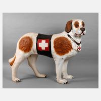 um 1910, Pappmaché und Masse farbig gefasst, bezeichnet Th. Schuffenhauer Chemnitz, vollplastisch gearbeiteter Bernhardiner mit eingesetzten Glasaugen, Halsband, Erhaltungsmängel, Altersspuren, H 100 cm, L 120 cm.