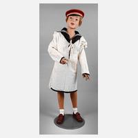 1935/36, geritzte Bezeichnung am Rücken P. IMANS PARIS sowie auf Bauchhöhe in roter Raute p. Imans PARIS, nicht mehr komplett leserlich, Modellnummer am Rücken sowie an den Händen 10453, Körper aus Gips farbig staffiert sowie aus Holz und einem Bezug aus Leinen gefertigt, die Arme mit Kugelgelenken beweglich, blonde Echthaarperücke, grüne Glasaugen, der Knabe trägt ein Matrosenhemd und eine rote Matrosenmütze, dazu Socken und rote Lederschuhe, Montierung auf Metallplatte, ein kleiner Riss an der Hand, eine Vielzahl kleiner Löcher, vor allem an den Beinen, an einigen Stellen Ablatzungen der Farbe, H 126 cm.
