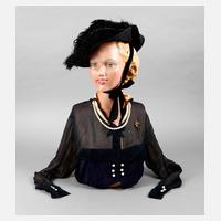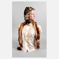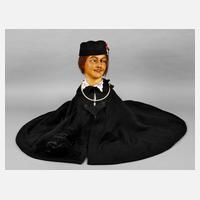 um 1900, Frankreich, Wachsbüste mit blauen Glasaugen, braunem kurzen Echthaar und 8 Porzellanzähnen in der oberen Reihe, ausmodellierte Ohren, sie trägt eine weiße Leinenbluse mit Spitzenkragen und -einsätzen, darüber ein schwarzes gefüttertes Wollcape mit Samtbesatz, beides um 1900, dazu eine Beuteltasche aus Samt und zwei Perlenketten, wobei eine wohl erst Ende des 20. Jahrhunderts hinzugefügt wurde, auf dem Kopf trägt sie eine schwarze Schiffchenmütze mit zwei Federn, darüber eine rote Rosette, befestigt mit einer Brosche in S-Form, neuere Montierung der Büste auf einem schwarzen Holzgestell mit Filzunterseite, linke untere Ecke der Büste mit roter ”6” bezeichnet, eine Reparatur an der rechten unteren Ecke, Wimpern sind größtenteils nicht mehr erhalten, ein Haarriss zwischen den Augen, ein weiterer vom Auge zum Haaransatz, ein Nasenloch ausgefranst, reinigungsbedürftig, H Büste 46 cm, H mit Gestell 61 cm, VL Cape 61 cm.