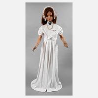 um 1970, Frankreich, Masse farbig gefasst, ungemarkt, abnehmbare Hände, Arme und Oberkörper, im Rücken der Puppe Schraubloch, Schuhe im Guss, abnehmbare braune Echthaarperücke, Gesicht ausdrucksstark gemalt, mit grün-braunen Augen, Kind in bodenlangem, besticktem Musselinkleid mit Schleife, dazu eine Brosche sowie eine Kette, Kleid mit minimalen Flecken, Hände in anderer Farbe, möglicherweise ausgetauscht, ein Haarriss am Arm, fleckig, H 127 cm.