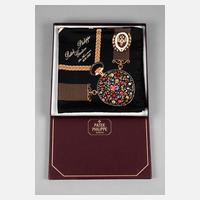1989, Sonderedition anlässlich des 150. Firmenjubiläums, quadratisches Tuch aus feinster, französischer Seide verziert mit Uhren und Blütenmotiven und handgerollten Saum, im Originalkarton, Maße 90 x 90 cm.