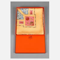 Entuwrf Michel Duchene 1998, gemarkt, Seidentuch mit handgerolltem Saum und Siebdruck ”Le Songe de Poliphile”, Motiv mit mythologischen Szenen, Floralmotiven und klassizierendem Dekor, im Originalkarton Hèrmes-Orange mit Broschüre, ungetragen, Maße 90 x 90 cm.