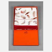 Entuwrf Henri de Linarès 1953, signiert, Reedition von 1999, gemarkt, Seidentuch mit handgerolltem Saum und Siebdruck ”Plumes”, Motiv mit Federn und rotem Rand, im Originalkarton Hèrmes-Orange mit Pflegeanleitung, ungetragen, Maße 90 x 90 cm.