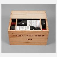 1983, gemarkt Chateau Vieux Blassan Bordeaux superior, Hersteller Max Treville Michel Querre á Libourne, 75 cl, original in Transportkiste verpackt, ungeöffnet, Altersspuren.
