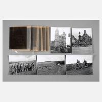um 1930, Aufnahmen von einem Motorradausflug ins Frankenland mit Wanderer 8-Ventil Rennmaschine, Portraitaufnahmen vor der Basilika Vierzehnheiligen und dem Nürnberger Hauptmarkt mit Frauenkirche und Neptunbrunnen, beigegeben fünf spärere Abzüge, Plattenmaß 9 x 12 cm.