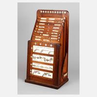 um 1910, Eiche braun gebeizt, hochrechteckigiges Display mit zehn herausnehmbaren, doppelseitigen Einschüben für Werbe- und Katalogblätter, original befüllt, Altersspuren, Maße 60 x 30 x 16 cm.