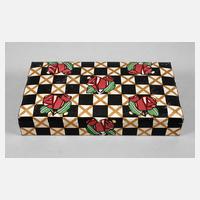 Entwurf um 1915 von Emanuel Josef Margold, Weißblech mehrfarbig lithografiert bzw. vergoldet, flacher, rechteckiger Korpus mit Schachbrett und stilisiertem Rosendekor, etwas berieben, Z 1, Maße 4 x 21 x 12 cm.