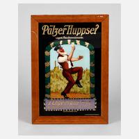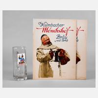 um 1900, Bierkrug Erstes Kulmbacher, zylindrischer Klarglashumpen mit konisch zulaufenden Zierauflagen, Ohrenhenkel defekt, H 19 cm, dazu zwei Werbeplakate Kulmbacher Mönchshof Bräu, signiert Ludwig Hohlwein München, Farblithografie auf Papier, leichte Erhaltungsmängel, Maße 35 x 25 cm.