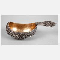 um 1900, Silberstempel 84 Zolotniki, Meisterpunze HS, Nicholai Zugeryev, tätig in Moskau 1898–1914, verziert mit reliefierten Blüten und Wellenbändern, der Griff als Tulpe mit Stängeln, innen Reste alter Vergoldung, gravierte Inschrift eines Grenadiers auf der M.S. Zarojanskoi, H 9 cm, G ca. 184 g.