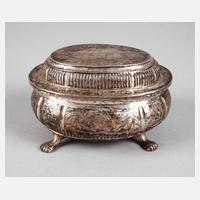 Moskau, um 1750, Stadtmarke Georg der Drachentöter, Meisterpunze AR, Afanasy Ribakov, Meister um 1729–1748, weitere kyrillische Meistermarke BG, Boris Garvilov Moskau, tätig um 1746–1752, ovale Dose auf vier Tatzenfüßen, mit abnehmbarem Deckel, reich ornamental graviert und in Niellotechnik geschwärzt, diese partiell berieben, an den Fußansätzen etwas eingerissen, Altersspuren, L 12, G ca. 173 g.
