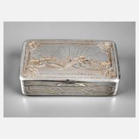 um 1920, Silber gestempelt 84 Zolotniki sowie Meistermarke ND, fein ziseliert und partiell geschwärzt, langrechteckige Dose mit abgerundeten Kanten und scharniertem Klappdeckel, dieser mit figürlicher Szene einer wilden Schlittenfahrt im Zweispänner, gerahmt von ornamentalem Dekor, Maße 1,5 x 9 x 5,5 cm.