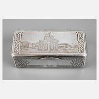 Moskau 1877, unleserliche Beschaumarke und Meistermarke, Stadtmarke Georg der Drachentöter, Silberstempel 84 Zolotniki, innen Reste alter Vergoldung, auf dem Deckel verschiedene Bauwerke graviert, Seiten und Boden ornamental graviert, Gebrauchsspuren, L 7,5 cm, G ca. 83 g.
