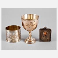 kleine Ikone, 19. Jh., bemalte Holzplatte mit Silberbeschlag und Aussparung als Anhänger mit Öse, Darstellung des Heiligen Nikolaus mit zum Segensgestus erhobener Rechten, dazu ein Serviettenring 1886 Moskau, später datiert 1953, kyrillisches Besitzermonogramm KS mit Krone, florale Gravur, weiterhin ein versilberter Becher mit Herstellermarke FLS, H max. 7,5 cm, G der beiden Silberteile ca. 44 g.