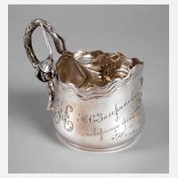 datiert 1881, Meistermarke JAL, unbekannt, 1868–1881 St. Petersburg, Beschaumarke AF mit Stadtmarke, Silberstempel 84 Zolotniki, quadratisch, auf vier halbkugeligen Füßen, fein graviert in Flechtoptik mit Aufschrift ”Guten Appetit” in kyrillisch, dazu ein Löffel 1877, mit Beschaumarke AK, die Laffenunterseite floral graviert mit Umschrift, Teeglashalter mit keinem Einriss an einer Delle, H 10 cm, L 16 cm, G der Silberteile ca. 173 g.