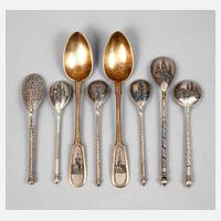 um 1900, Silber vergoldet, gestempelt 84 Zolotniki, graviert und in Niellotechnik geschwärzt, vorwiegend architektonische Ansichten, verschiedene Formen, Kaffee-, Eis-, und Mokkalöffel, altersgemäß guter Zustand, G ca. 148 g