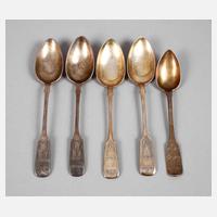 alle 2. Hälfte 19. Jh., verschieden gestempelt und datiert, vergoldet und fein graviert, die Laffenunterseiten mit ornamentalen und floralen Motiven, 2 + 2 + 1 Stück, normale Altersspuren, L max. 16 cm, G ca. 140 g.