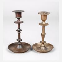 Russland, 1. Hälfte 19. Jh., in kyrillisch signiert 1-frolow, der andere A.iS, einflammige Biedermeierleuchter mit breiten Tropfschalen, reinigungsbedürftig, sonst normale Gebrauchsspuren, H 16 cm.