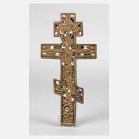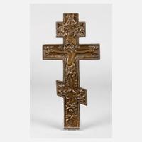 Ende 19. Jh., Bronze, bräunlich patiniert, Darstellung des Gekreuzigten im Typus der Viernagelung, über ihm Gottvater und der Heilige Geist in Form einer Taube, flankiert von zwei Engeln, rückseitig kirchenslawisch bezeichnet, H 35,5 cm.