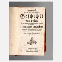 Entwurf einer pragmatischen Geschichte von Polen, bis auf itzt glorwürdigst regierende Königliche Majestät Stanislaum Augustum, insonderheit für junge Standes- und andere wohl zu erziehende Personen, gewidmet von Gottfried Stolterfoth J. V. Cand, Danzig 1766, Format Kl. 8°, 1298 S., Halbledereinband der Zeit mit Rückenschildchen, bunt marmorierter Schmuckvorsatz, Rotschnitt, aus dem Inhalt: Vorläufiger Bericht von dem Ursprunge der Nation, Das Piastische Haus von 840–1385, Das Jagellonische Haus von 1386 bis 1572, Könige aus verschiedenen Häusern von 1572 bis 1764, Beiträge zu den Staatsveränderungen und Begebenheiten in Polen, normale Altersspuren, Einband an den Kanten berieben, altersgemäß schöner Zustand, selten.