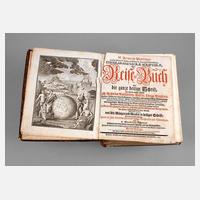 M. Heinrich Büntings, weiland Pfarrer der Kirchen zu Grunau im Herzogthum Braunschweig, Itinerarium Sacrae Scriptae, Oder: Reise-Buch über die ganze heilige Schrift, in deren ersten Theil alle Reisen der Patriarchen, Richter, Könige, Propheten, Fürsten, Völker des alten Testaments .... mit vorgefügter Beschreibung der Stadt und des Tempels zu Jerusalem, Im andern Theile aber über das neue Testament gezeiget werden die Reisen der Jungfrau Mariä, Josephs, und der Weißen aus Morgenlande ... nebst einem Tractat von den Münzen und Maasen in heiliger Schrift, mit einem zwiefachen Anhange: Herrn M. Joh. Christian Herrlichs heilige Geographie und Chronologie, und M. Wendelini Schemps Historia von dem Leben der zwölf Apostel und der Evangelisten, Mit saubern Kupfern und Landcharten gezieret ... Dritte Auflage, Erfurt bei Jungnicol 1757, Format 4 °, 24 S./496 S./298 S./112 S./102 S./378 S., zahlreiche Kupferstiche, wenige Seiten fehlend, darunter Karte nach S. 24, Stich nach S. 12, Register am Ende ab Paulus ... appelliret an den Kayser, Ledereinband (leicht wurmstichig) der Zeit mit Rückenprägung, bibliographische Bleistiftnotizen hinter dem Deckel, normaler altersentsprechender Zustand.