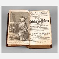 Helden-, Staats- und Lebensgeschichte des Allerdurchlauchtigsten und Grosmächtigsten Fürsten und Herrn, Friedrich des Andern, jetzt glorwürdigst regierenden Königs in Preussen, Churfürsten zu Brandenburg, auch souverainen und obersten Herzogs in Schlesien, Fünfter Theil welcher die merkwürdigige Geschichte des 1758 und 1759sten Jahres enthält, Frankfurt und Leipzig 1760, Format Kl. 8°, 1195 S., Portraitkupferstich als Frontispiz, sechs Schlachtpläne in Kupferstichen, Ganzledereinband der Zeit, Einband an den Kanten deutlich berieben, Alters- und Gebrauchsspuren, innen guter bis befriedigender Zustand.
