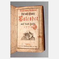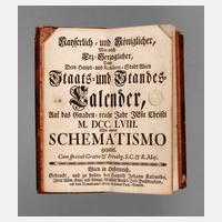 Kayserlich- und Königlicher, wie auch Erz-Herzoglicher, dero Haupt- und Residenz-Stadt Wien Staats- und Standes-Calender, ..., mit einem Schematismo ..., gedruckt und zu finden bey Leopold Johann Kaliwoda, Format Kl. 8°, 516 S. und 6 Blatt, Ganzledereinband der Zeit, gesprenkelter Rotschnitt, am Rücken und am Gelenk sicherungsbedürftig, innen altersgemäß guter Zustand.